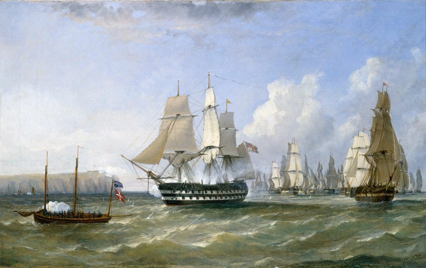 So, let’s start with some definitions. A convoy is a group of ships sailing together for mutual protection. Often, though not always, convoys have naval escorts—armed ships tasked with herding the flock and defending it from attack. Here’s a British convoy entering the Baltic in the Napoleonic Wars: